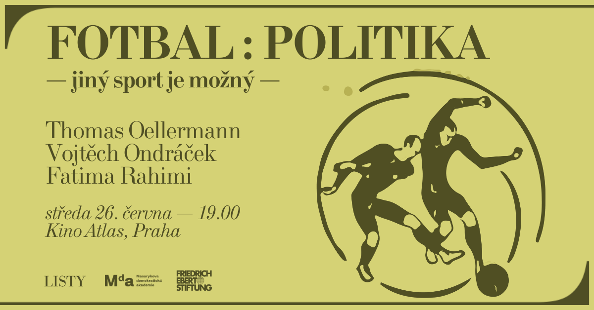 Fotbal : politika – jiný sport je možný. Ale jak? A jaké jsou jeho příběhy? Přijďte na představení fotbalové přílohy Listů spojené s debatou o různých podobách sportu a jeho vztahu ke společnosti, politice nebo ekonomickým vlivům. Hosty budou Vojtěch Ondráček, Fatima Rahimi a Thomas Oellermann. Těšíme se na vás ve středu 26. června od 19.00 v Galerii Karla Vachka v pražském Kině Atlas. Zájemci mohou po debatě zůstat na společné sledování zápasu fotbalového Mistrovství Evropy Česka proti Turecku.